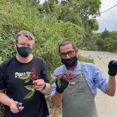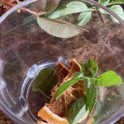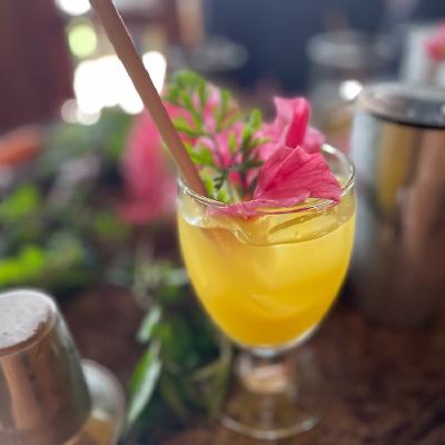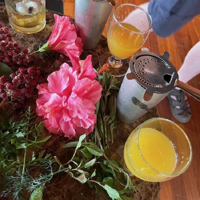 We then got to make our own cocktail from some of the items we’d gathered from the garden - first selecting the spirit and then crushing the leaves together with a caramelised orange segment. We then added these to a shaker with Guaro, syrup and ice and shook it. Diego smoked the glasses on a pine smoker, added ice and then we poured the cocktails in and garnished with more findings from the garden - in this case some flower petals and a carrot leaf.