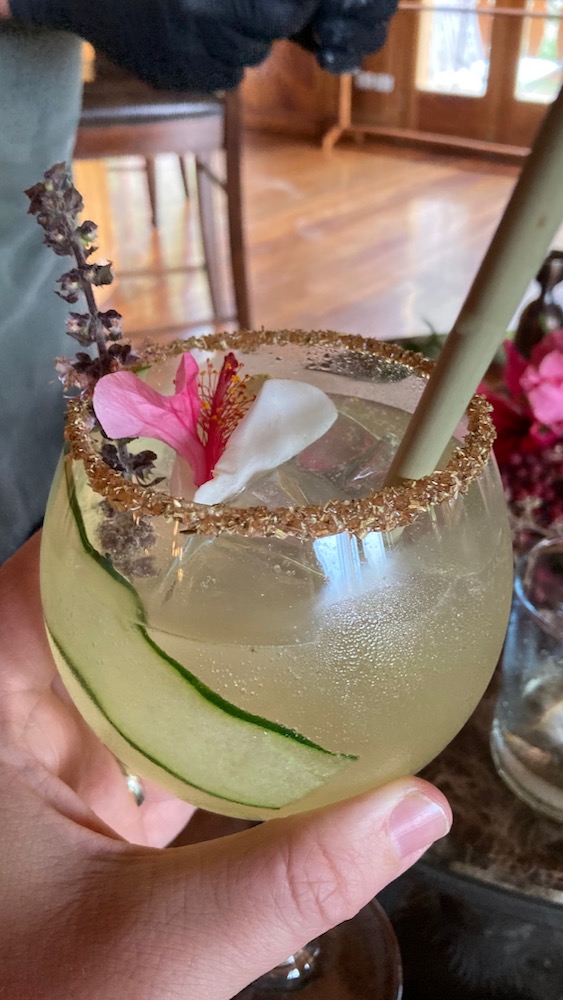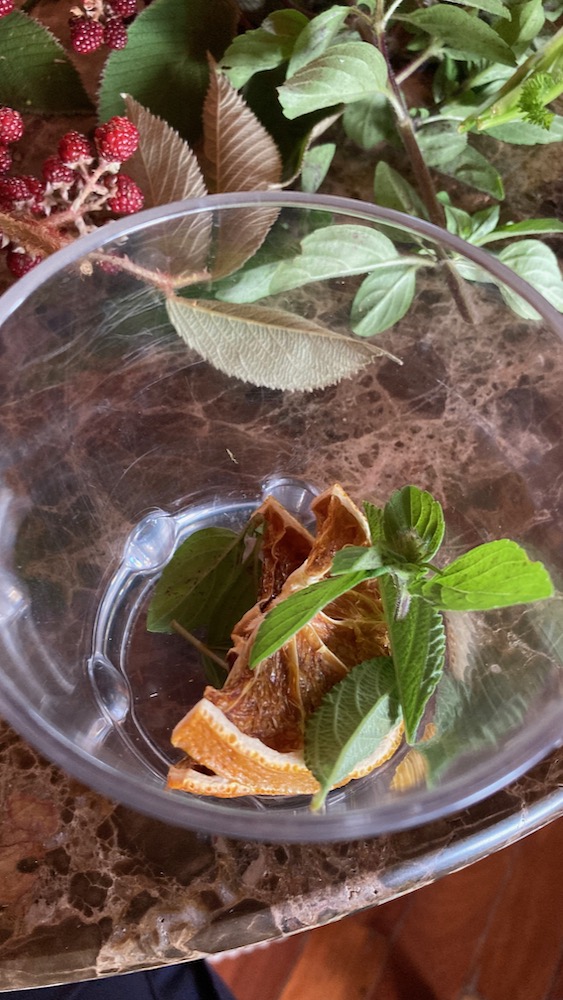 In the afternoon Laura and I did a ‘garden to glass’ experience at the Hotel, just the two of us, where Diego took us first around the gardens of the hotel to see their sustainability at work and the different plants they grow and how they can be used. We took a basket around with us and gathered lots of sprigs of herbs, flowers and even wild blackberries.