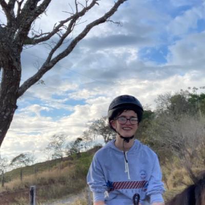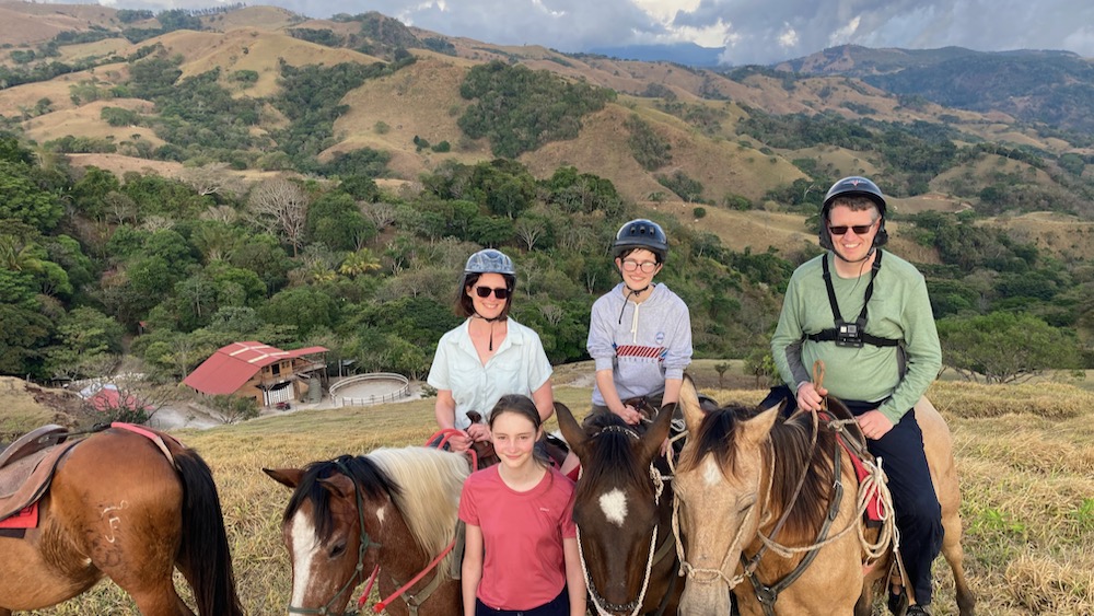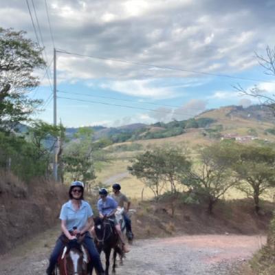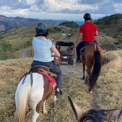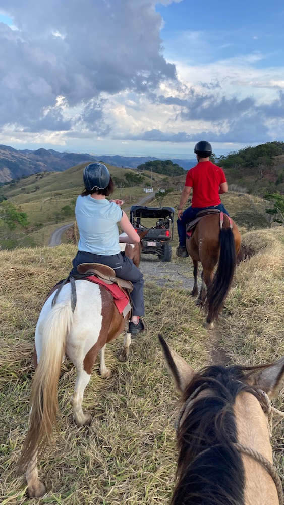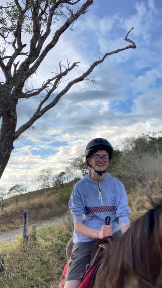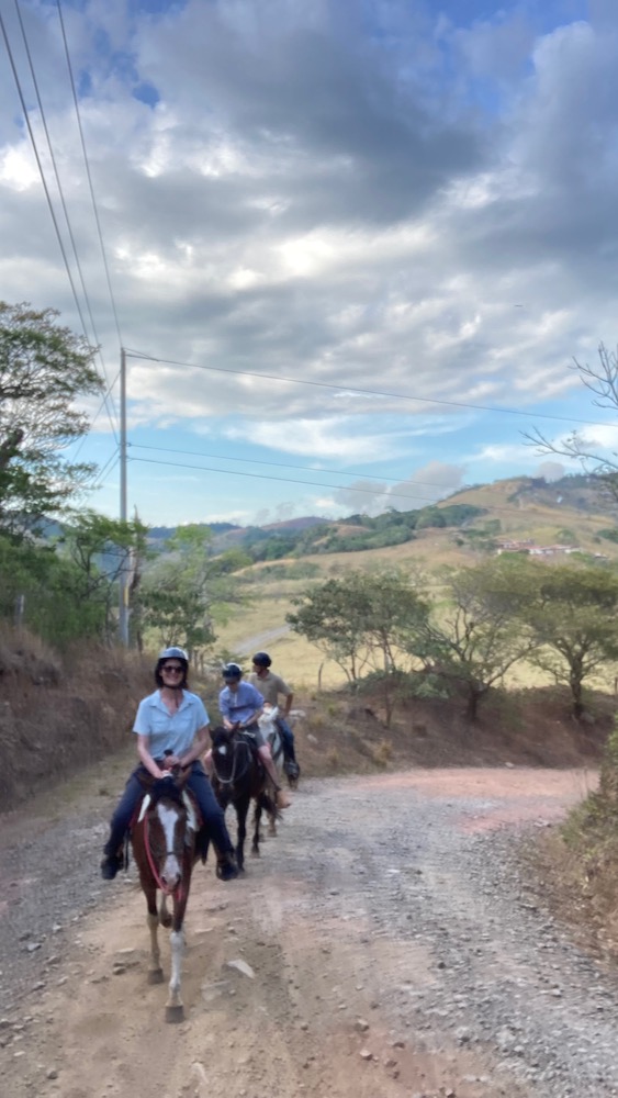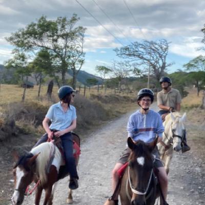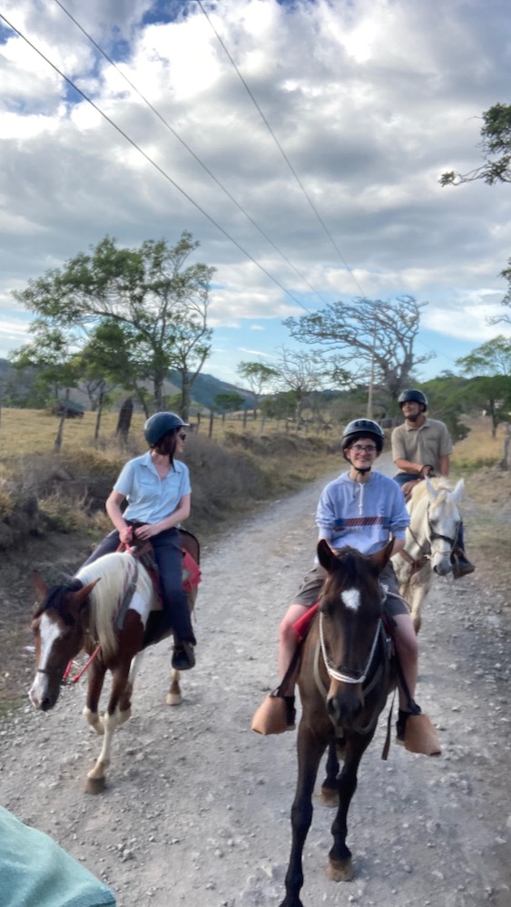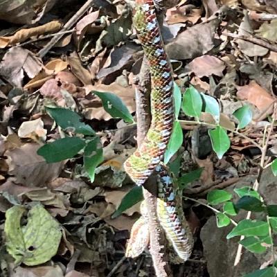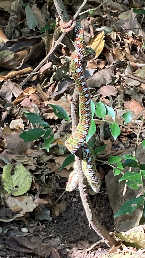 After the animals had been fed, it was time to head outside and learn how to ride the horses. I was first onto my horse and successfully managed to guide it around and over to the water trough, but it wasn’t interested in drinking any. We rode for about 45 minutes up and down the stony paths, through the forest and across streams. At one point Oscar stopped and signalled we should all stop behind him as he’d seen a snake - a pit viper in the tree at the side of the path.